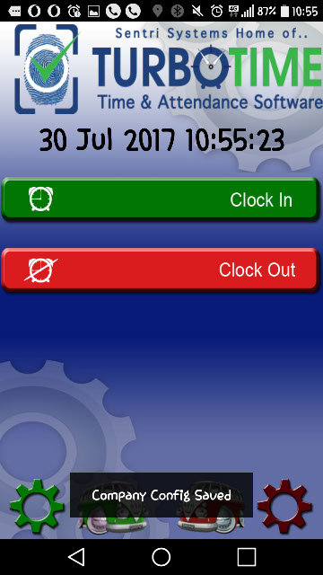 Click on the green cog and the clockings are sent to the cloud. (The red cog accesses the settings screen). The two vans are used to clock the start and end of trips. The procedure is the same as for T & A clockings